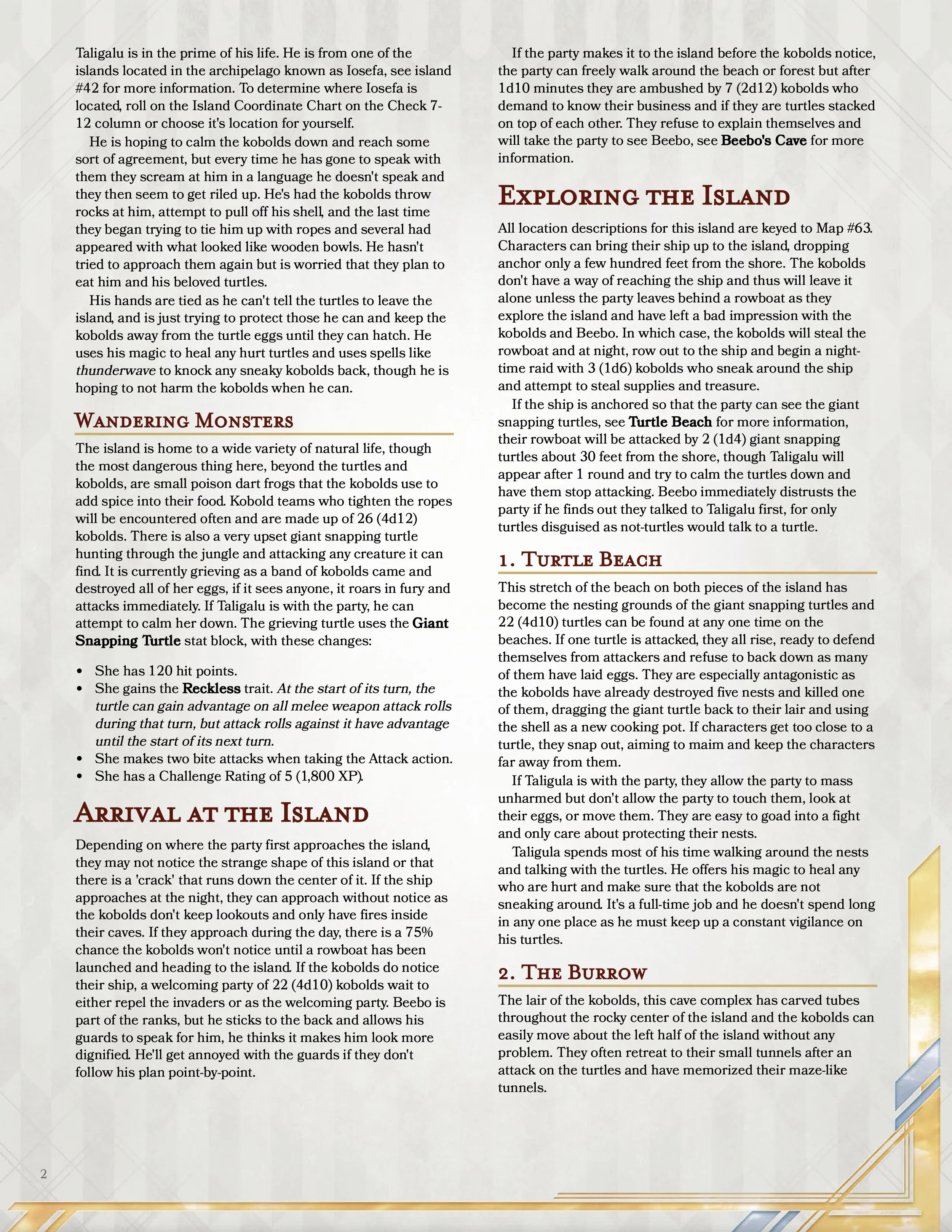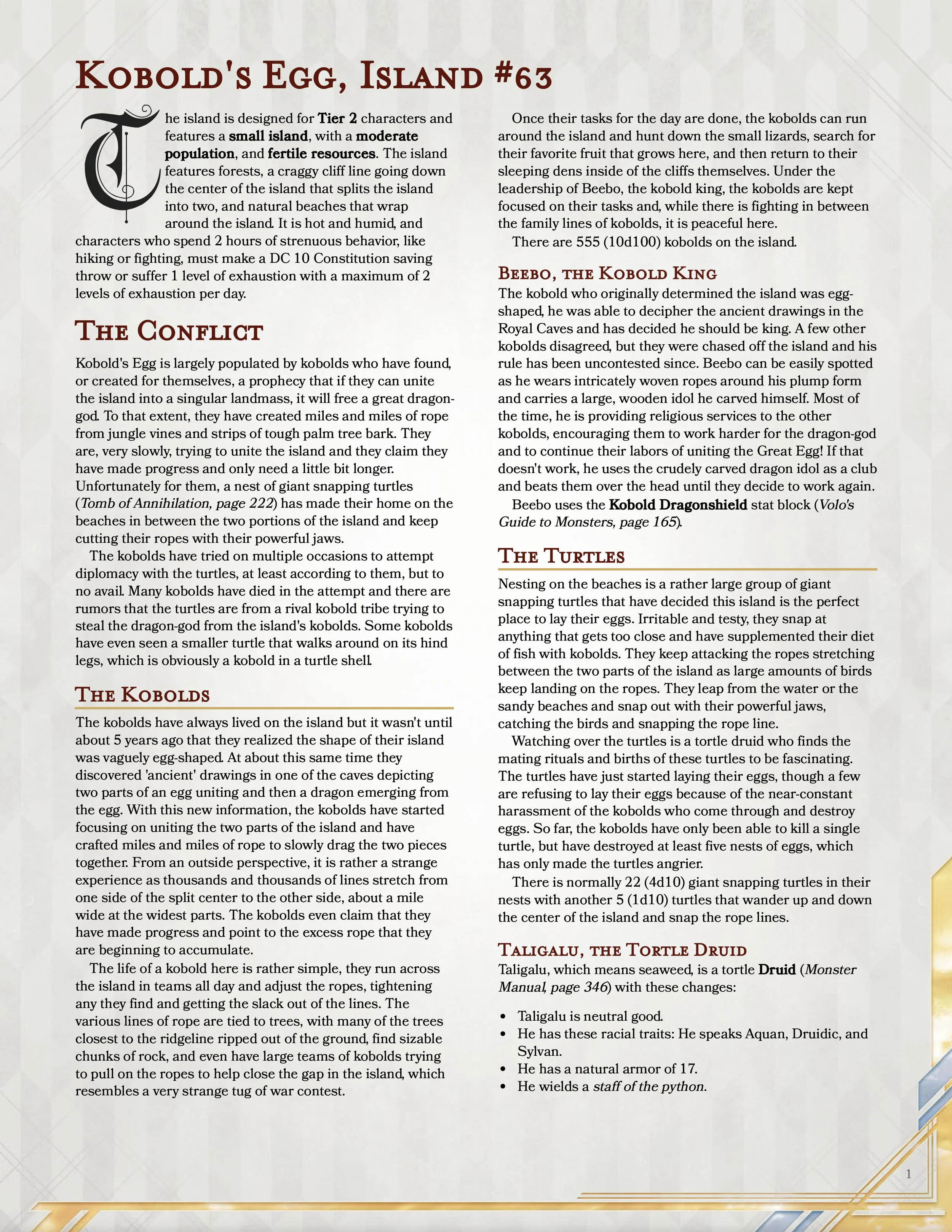 I’d like to be the first to welcome you to Kobold’s Egg, a fantastic island in the peculiar shape of an egg, over run with kobolds, and giant snapping turtles. This island brings the party’s to a difficult decision, side with the hilarious kobold or with the turtles and druid just trying to get by in life. My personal opinion is to side with the kobolds, but I’m also a bit bias towards kobolds.