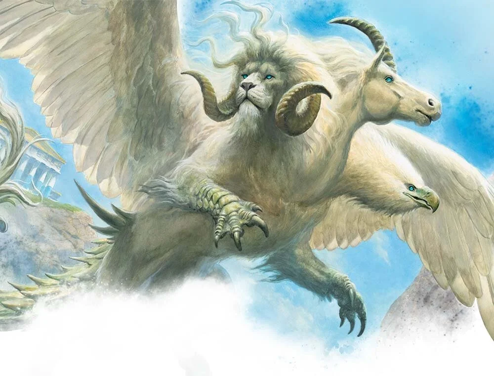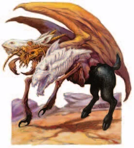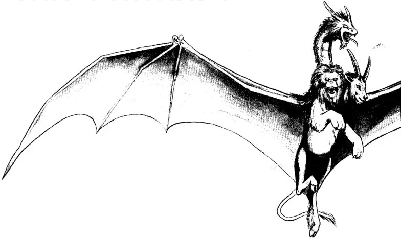 In Dungeons & Dragons, a Chimera is the combination of the goat, lion, and dragon. It has the wings of a dragon attached to the lion's body, with the hindquarters and rear legs of a goat, with the heads of all three. The dragon head can turn you into an extra crispy adventurer by breathing fire, the goat will gore you with its horns, and the lion will tear at you with its massive jaws filled with razor-sharp teeth.
