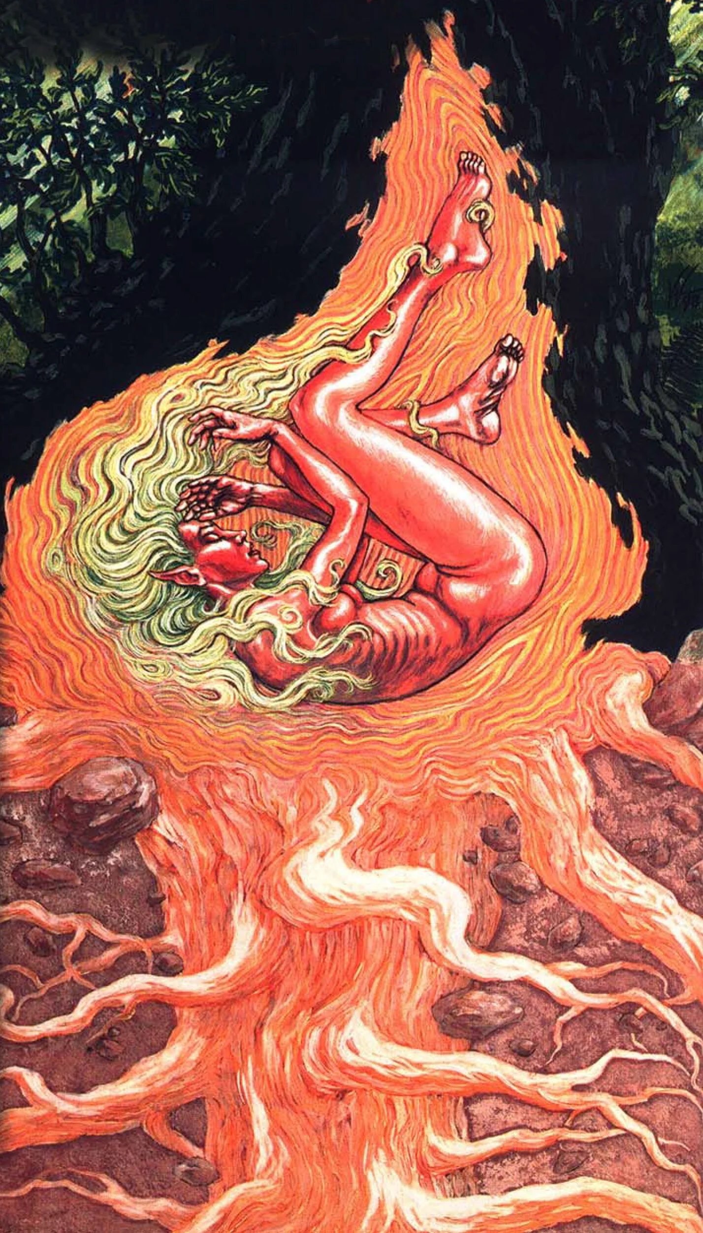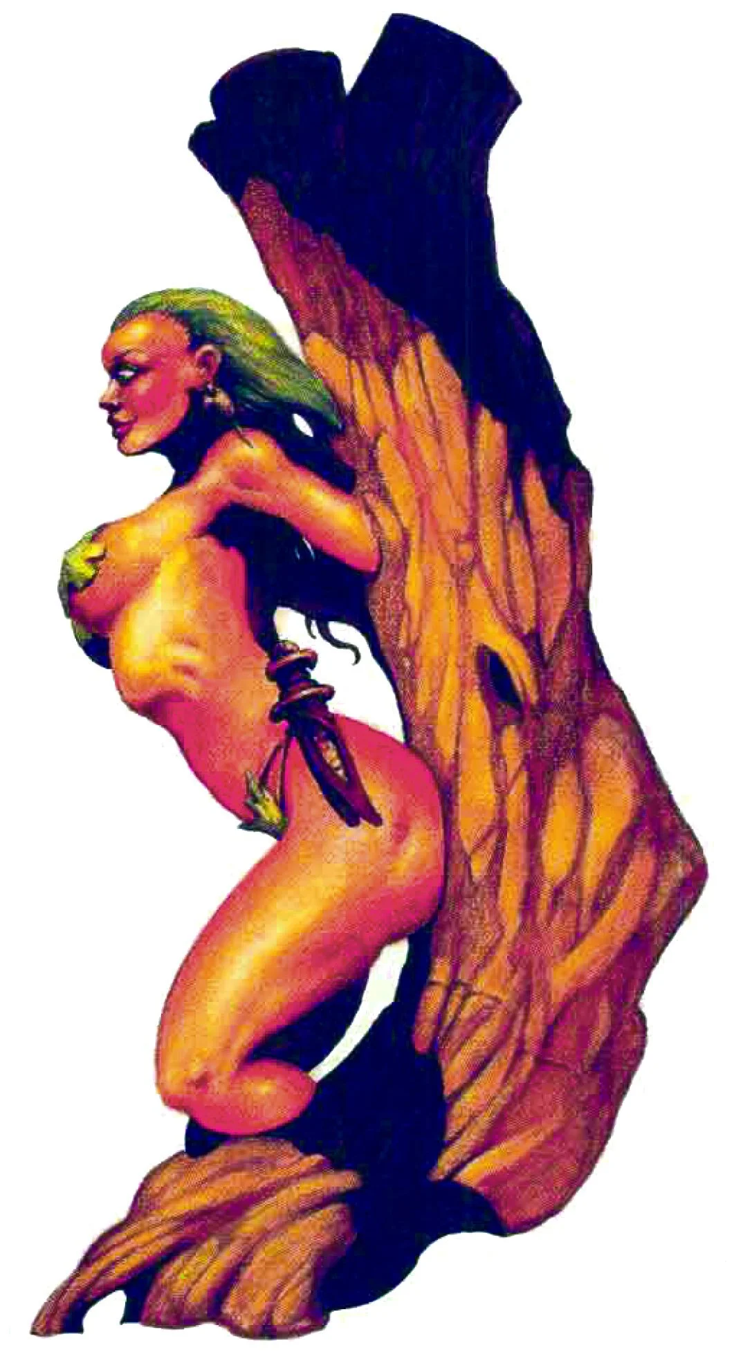 In Dragon Magazine #101 (Sept. 1985), we learn more information about the Hamadryad, a powerful version of the Dryad with additional power and abilities. The Hamadryad still lives deep in the forest is bound to a tree. Unlike a dryad, a Hamadryad can leave the vicinity of the oak tree and travel any distance from the tree. It doesn't mean they will always be leaving their forest, as they have a deep disdain for other locations, but they can at least go on a pizza run for the rest of the Dryads. They are protectors of the entire forest in which they dwell, and while still shy, they will work with rangers and druid to keep the forest free of danger. They are more potent than common cousins, being able to use the following powers at will, one per round: animal friendship, entangle, pass without trace, speak with animals, and quench fire. It is also said that the touch of a Hamadryad can cure a horrible disease known as Nilbogism, which can cause certain goblins to go a bit crazy. However, this rumor is unconfirmed.