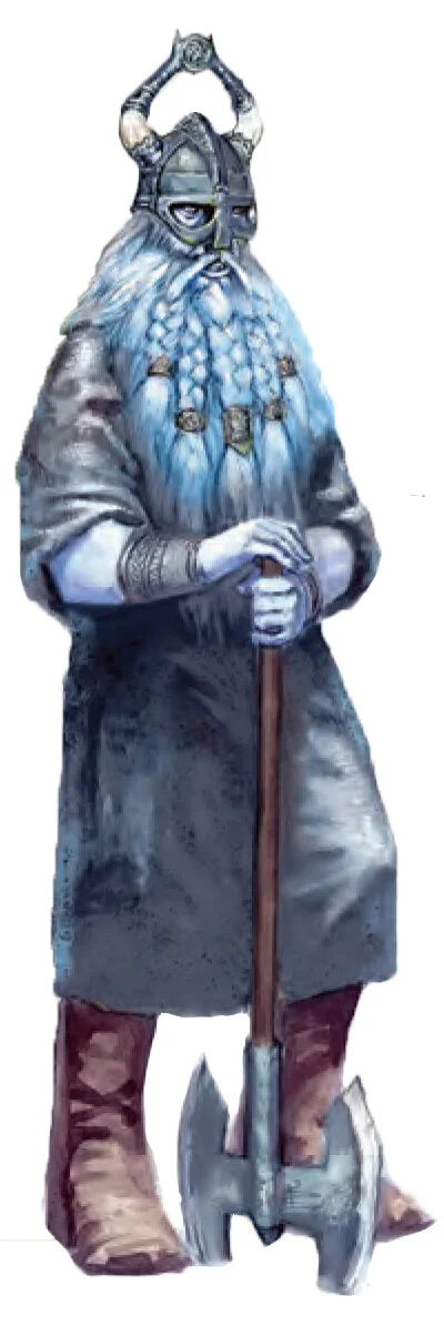 Chiefs are far stronger than the Frost Giants, often wielding magic weapons or enhanced armor, but if they can gain command over 20 others, they earn the title of Jarl. For some comparison, a regular giant’s natural Armor Class is 5, an elite guard will wear chain mail and metal helmets with horns and feathers, even though horns on helmets are a horrible idea, and have an AC of 0. The jarl has an AC of -3 as they wear magical plate mail along with fancy animal pelts and lots of jewelry.