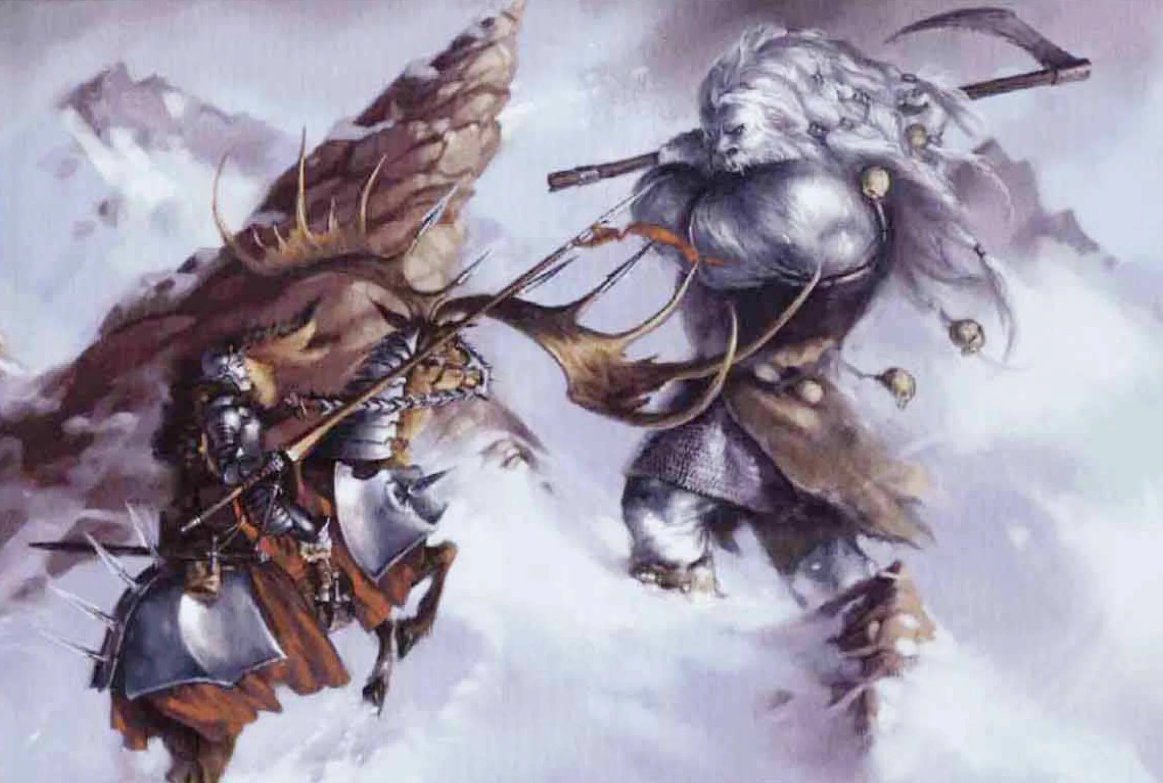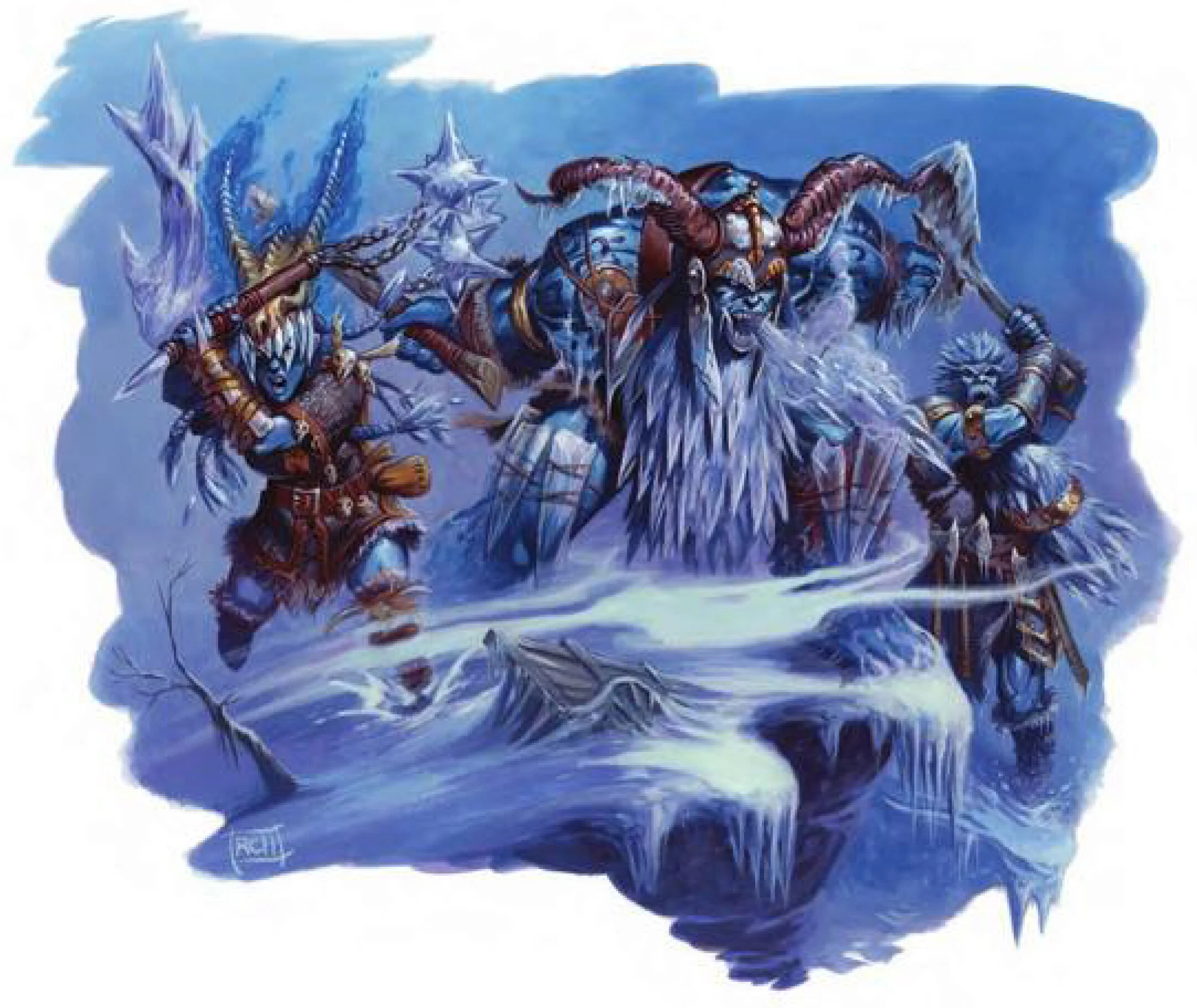 Our last bit of information on the Frost Giants comes in the Player Options - Heroes of the Elemental Chaos (2012) and describes the greatest kingdom of the Frost Giants located in the Elemental Chaos. Kaltenheim is ruled over by the Thrym, a powerful Frost Titan of unbelievable power and might. Kaltenheim stretches across vast expanses in the Elemental Chaos with snow-covered tundras, icy mountains, and frozen seas. While there are non-giants in these lands, they are all slaves to the Frost Giants and are forced to labor away in the frozen wastes like creating fine or delicate craftwork, building their feast halls and castles, or tending to the herds of cattle. The only way for slaves to gain any type of prestige is to have the gift of magic over ice, those that can control the element are treated with respect and given greater tasks set by the Jarls.