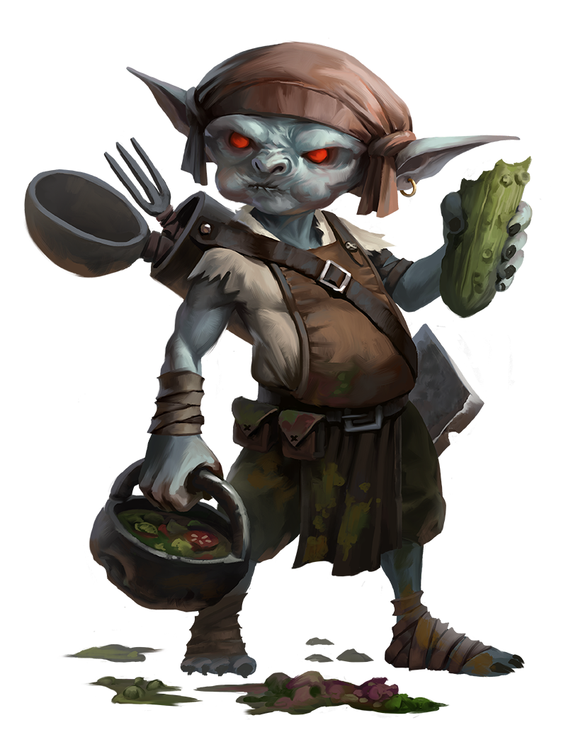 Standing at just three and a half feet tall, this goblin carries a large pot and his clothes are coated in years of filth and old food. He always has something to chew on in his hands, or licking old food remains off his clothes.