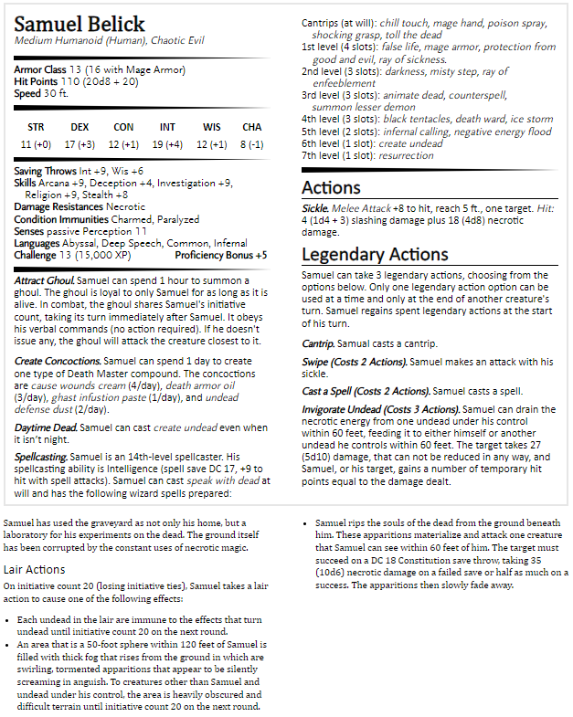 Immersing himself in everything he could find about raising the dead, Samuel became obsessed with the power of animating creatures. Combining magic and alchemical science, Samuel was able to bring back all manners of creatures but only for a brief time. As he went farther down this dark path, Samuel found that the twisted magic of demons and devils was his best chance at succeeding in his quest.