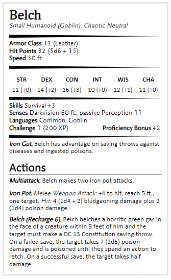 Belch has spent most of his life in a wanderlust for new food. All goblins are known for their unlimited appetite, but Belch is an oddity among his own kind. While a goblin might eventually become full after a full day of feasting, Belch has never found his limit. He has consumed whole hogs, devoured the jellies of an ooze, and digested what otyughs would not.