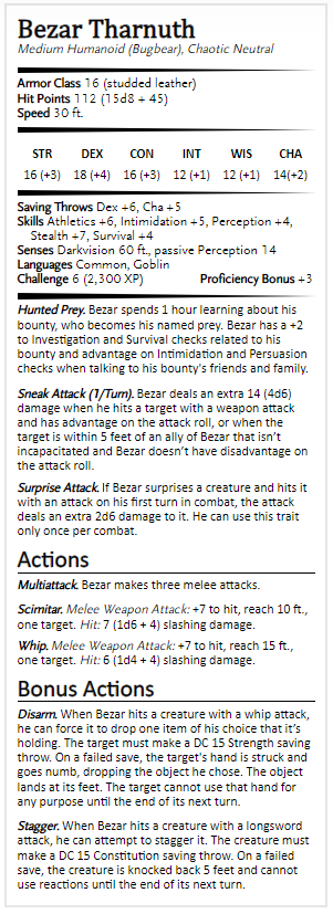 Bezar has always had a talent for tracking creatures. When he was young, he could find dinner when traveling with his family. Bezar could follow a target undetected through a crowded street or down a dark alley when they settled in the city. He did this for fun in his youth, but as he grew older, Bezar realized these skills could be put to profitable use.