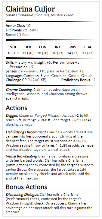 Clairina has short golden brown hair and lively brown eyes. Clairina will give a wry smile to an individual before eviscerating them with her castigating retort. Short for even a gnome, Clairina wears platform boots to appear taller.