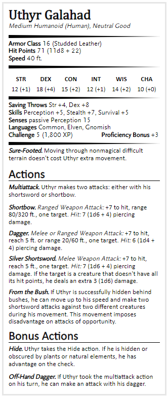 Uthyr stands at 6-feet, 3-inches though he is typically stooped over to help hide his large frame behind trees, bushes, and other natural cover in the forest. He wields a silvered shortsword and his leather is as mud-stained as his deeply tanned skin. His greasy black hair is left unkempt and haphazardly shorn to keep it out of his dark eyes.