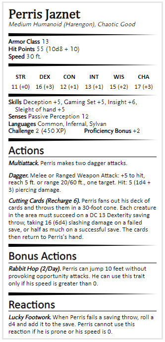 Perris now travels the Planes in search of his next game, always on the lookout for a table of big money behind which are players with little skill. When he sits down, his goal is simple. Win as much as he can, as quickly as he can. Perris will then move on, lest he becomes the target of someone's ire. These games keep Perris in the lifestyle he has grown accustomed to. While not lavish, Perris has a taste for the finer things in life, whether food, wine, or clothing.