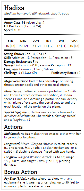 Like most eldarin, Hadiza has never met a beautiful or rare object she has not wanted to possess. She set off at a young age to travel the planes in search of treasures others could only dream of. She found her way to the Nexus of the Planes which she made her base of operations for over the last 200 years. During this time Hadiza visited every plane of existence she could find a portal to.