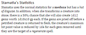 Reshaping Her Life. Several more decades passed before Stamatia had decided on her next course of action. She had petrified dozens of adventurers and monsters by this point and had learned all there was to know about her powers and stone. Thanks to petrifying a recent adventurer, Stamatia was able to acquire a hat of disguise and began her plan to return.