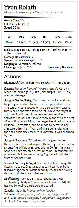 Raised by her mother in the city of Achaab, Yvon dealt with the same struggles other tiefling children endured. Yvon had it easier than her tiefling friends, as her beautiful voice would turn those who might mistrust her into friends, if only for a short while. Her mother, a bartender in a small tavern located near the merchant district, often brought Yvon to keep her safe and eat a hot meal. Seeing an opportunity to make a little coin, Yvon would often sing about love and sorrow, controlling the audience's emotions like a symphony conductor.