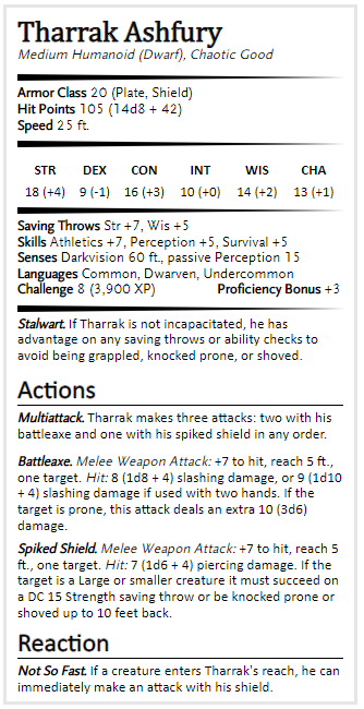 Standing at four and a half feet, Tharrak is a heavily built dwarf with a thick, squat frame. Thick scars criss-cross his face, a testament to a life of conflict and battle. He has thick red hair pulled back and a full beard kept short. He wields an axe etched with intricate runes and carries a shield covered in spikes stained dark from repeated use.