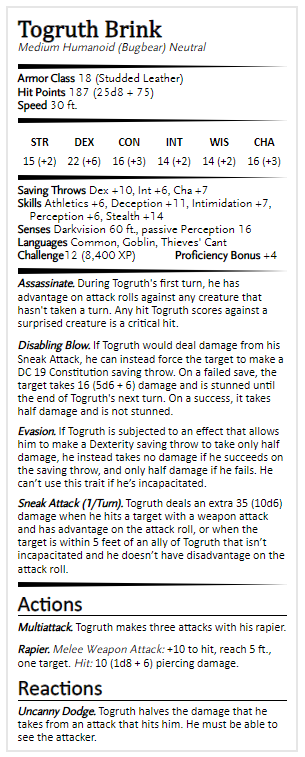 Togruth stands 6 1/2 feet tall, and his muscular torso is hidden under his dark gray fur. Unlike most bugbears, his facial expressions are usually neutral, but he will flash a wicked scowl when a member of the guild fails him.