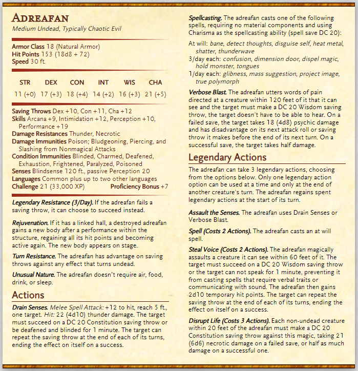 An adreafan (pronounced: uh-dree-fin) is a foul creature who must survive on the experiences and sensations of other creatures. In a bard's vain search to secure ever-lasting life, they learned that by taking the sensations of others, they could prolong their own life into undeath, giving them unique qualities that, while not life sustaining, it is unlife sustaining.