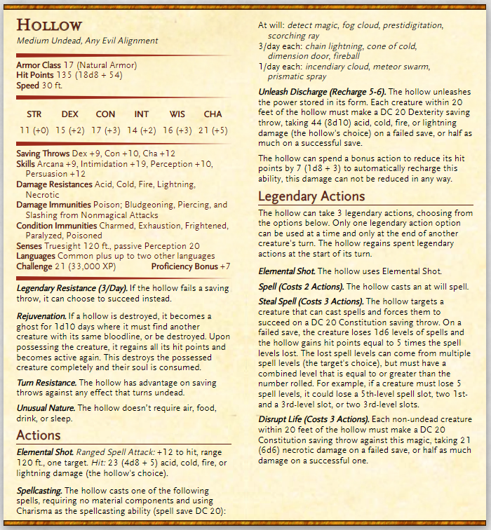If the hollow is ever destroyed, it transforms into an ethereal ghost that has little control over the world. While it is in this vulnerable state, it must seek out another creature of its bloodline and possess them. If it does so, it purges that creature of its soul, transforming the body into its previous form, reforming itself as a hollow. If it takes more than a few weeks for the hollow to find a suitable candidate, it becomes a mindless ghost, incapable of returning to its hollow state from before. Because of this, many hollow send out their henchmen to kidnap victims and keep them imprisoned just in case the hollow needs them for feeding or a new body.