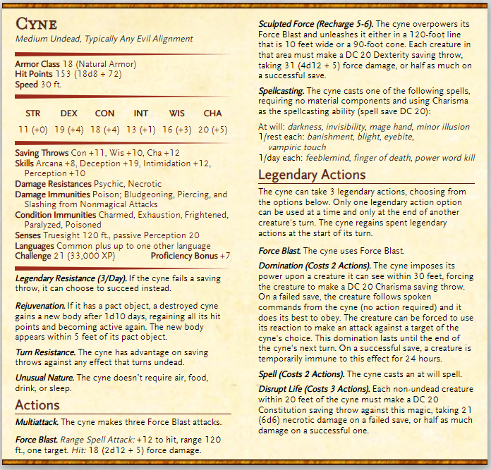 Cyne (pronounced: sin) are made up of spellcasters who have made deals and pacts with entities for magical power, such as warlock, and have then absorbed their patron. Since cyne are created by warlocks who break pacts and deals, attacking their patron and attempting to drain the patron of their power, patrons weigh the risks when first offering their knowledge to a petitioner. Unfortunately, they don't always get it right and their protégé turns against them.
