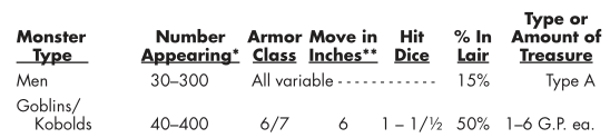 The original edition is pretty… rough. Not only is the information broken up into two places, and by the time Greyhawk (1975) comes out, it’ll be broken up into four places, but the information provided just isn’t that good. In addition, certain monsters like the lovely kobold above, doesn’t even get their own statistics, instead, it is hidden in another creature’s statistics.