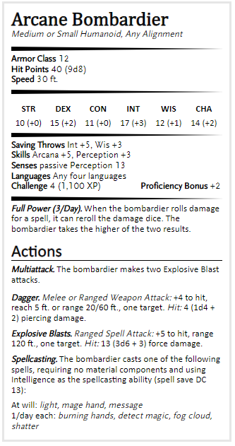Stat Block Arcane Bombardier (below), Acolyte, or Mage