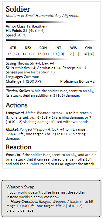 Stat Block Elite Guard (below), Soldier (below), or Veteran