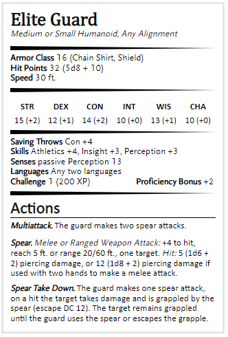 Stat Block Elite Guard (below), Soldier (below), Knight, Gladiator, or Veteran