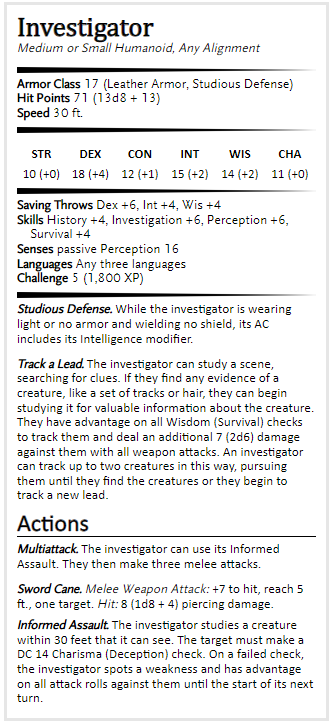 Investigators are often likened to celebrities, as the broadsheets will heavily report on what cases they are on, what leads they could be following, and even offering their own ‘theories’ and ‘hints’ as to who the culprit might be. All of this to sell more copies of their broadsheets, but it has given a few investigators a test of fame. Some have used this to further a writing career with crime dramas and autobiographies while others have done speaking events for the curious public.