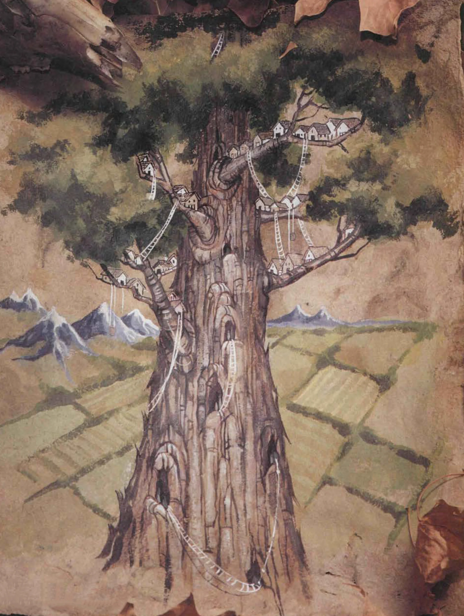 Grandfather Oak is a massive tree that rises high above the forest and the inhabitants view the tree as a living and sentient creature that slowly morphs its shape to fit its occupants. Fire is restricted in the city, and punishments are extreme for those who allow any fire to get away from them, especially during the fall when the leaves are dry and still hanging from branches. Life on the Grandfather Oak goes by in a blur of revelry and great hunts throughout the forests.